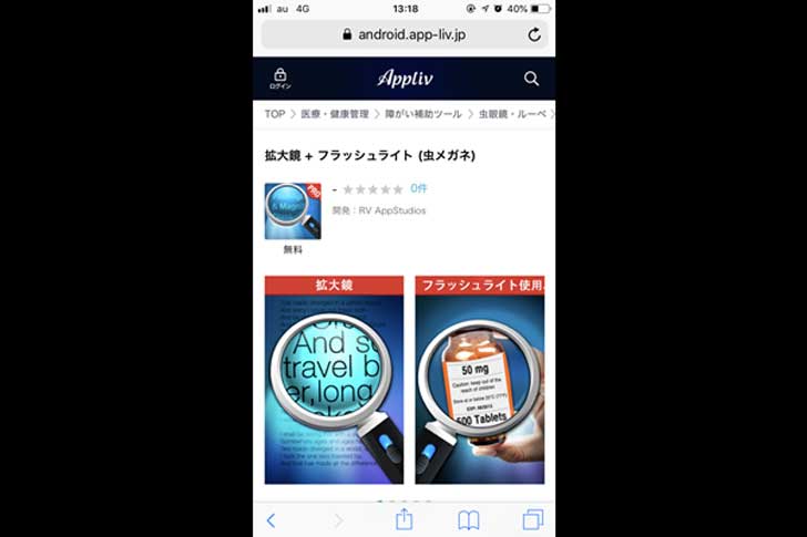 今回はシンプルに拡大鏡とフラッシュライトを使える無料アプリを選択。ダウンロードしました。